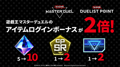上記期間中は遊戯王デュエリストポイント公式サイトTopページで受け取れる「遊戯王 マスターデュエル」のアイテムログインボーナスが2倍に増量!